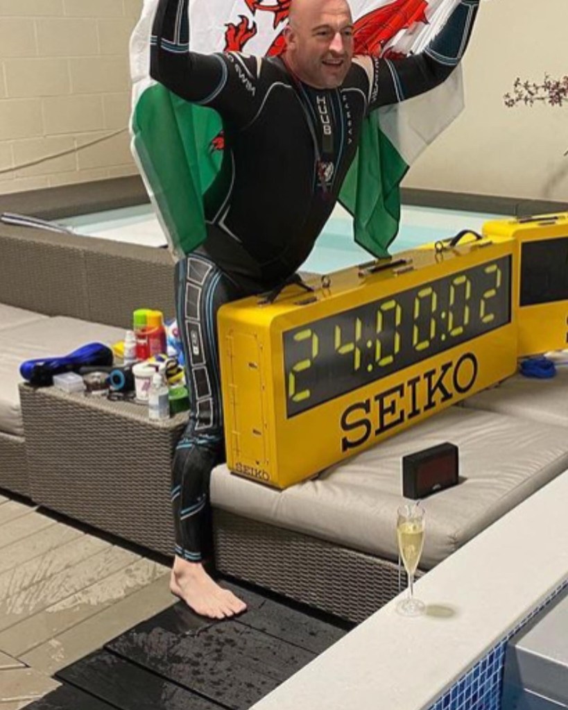 My name is Dave Tonge & I’m a world record holder. I have a world record for longest wetsuit swim in an endless swimming pool. I swam for 24 hours to raise money for Velindre cancer Centre in Cardiff, Wales.